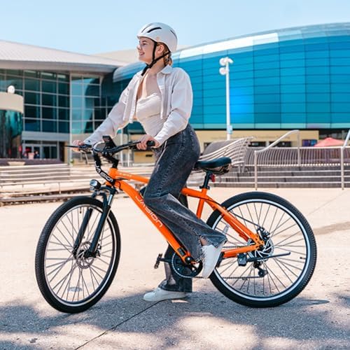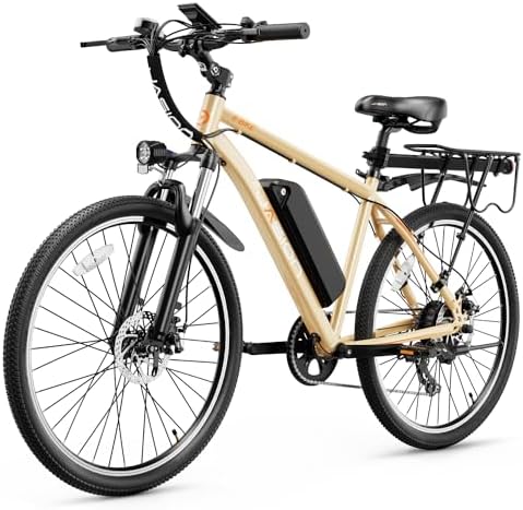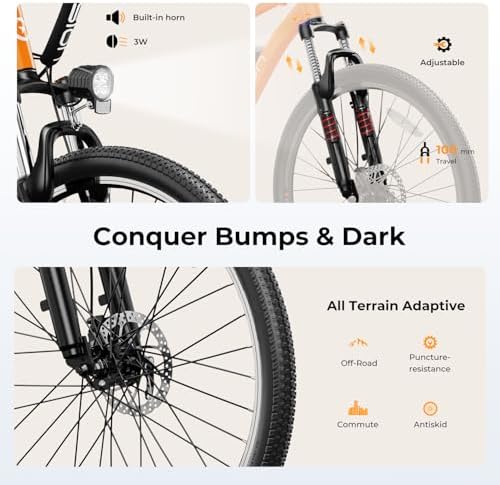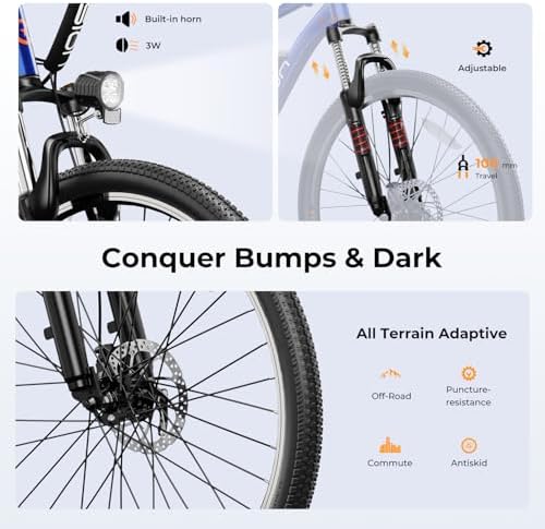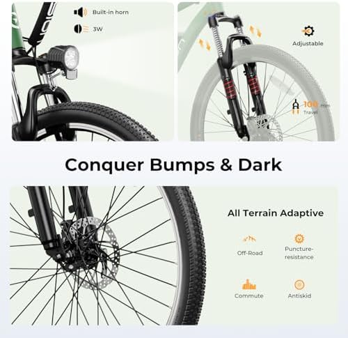 The 26″ puncture-resistant tires ensure durability, and the high-strength front fork suspension combined with 7-speed gears and dual lights enhance your ride experience. Dual mechanical disc brakes keep you safe on complex terrains. With the LCD display, navigating becomes effortless.