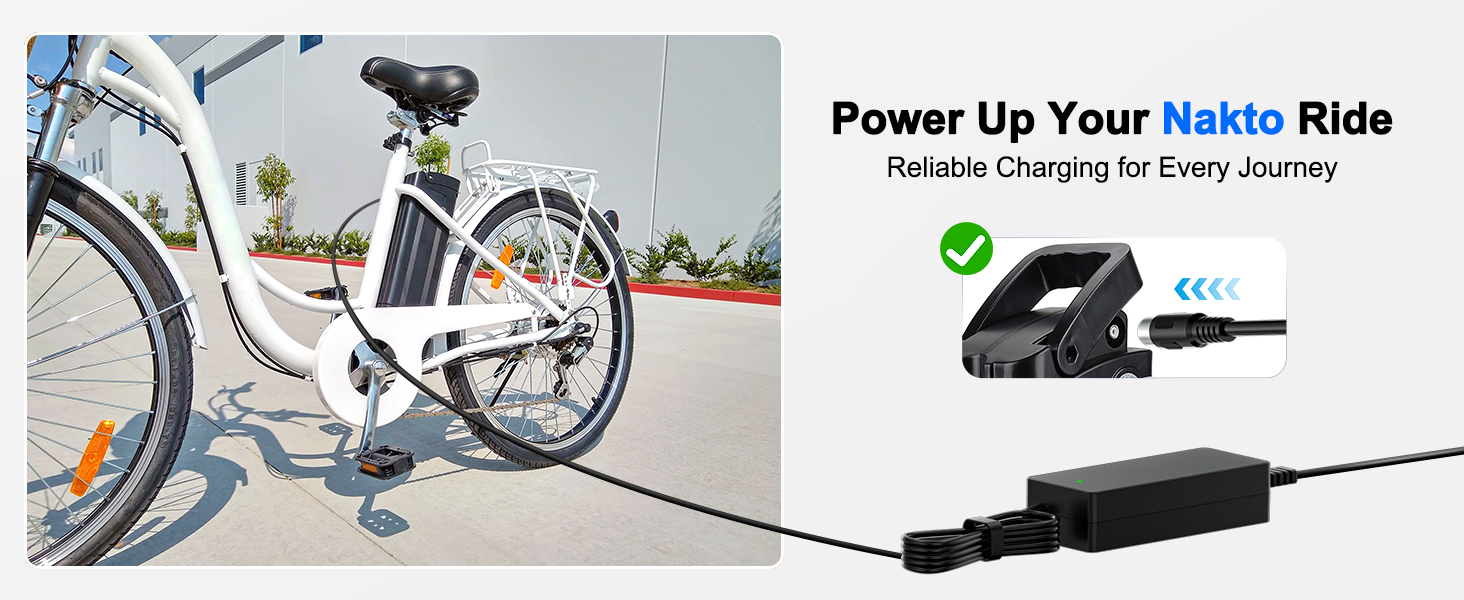 Wide Compatibility: This charger is compatible with a wide range of Nakto electric bikes and scooters. It works perfectly with models like the 36V Classic 26″ City/ Cruiser 26″ Fat Tire, Elegance 22″ City, Fashion 20″ Folding, Men’s Camel 26″ 250W City/Mini Cruiser 20″ Fat Tire, Pony 20″ City Cargo, Stroller 26″ City, Women’s Camel 26″ City eBike, and Glion Dolly Electric Scooter.
