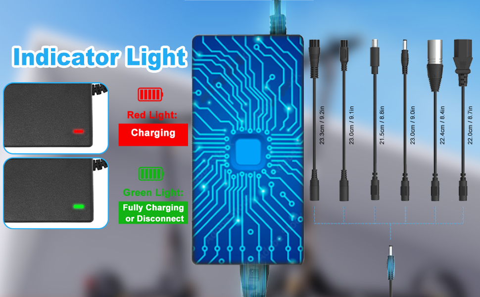 Includes a versatile interchangeable plug collection: DC5.5×2.1mm, DC5.5×2.5mm, 8mm airline 3-pin head, 12mm airline 3-pin head, 3-Pin Male XLR head, 9mm RCA head, and a Universal IEC plug head. Works seamlessly with most 48V/54.6V 2A lithium-ion devices without extra adaptors, ensuring hassle-free charging.