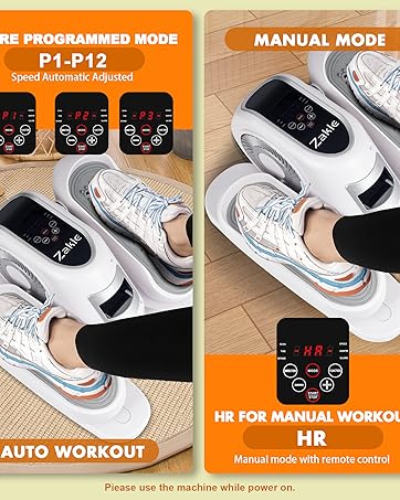 Our elliptical leg exerciser offers a dynamic workout experience through both auto and manual modes. Seniors can select from 1-4 low speed levels for leg exercise and relaxation. In manual mode, you can set up to 12 speeds and forward or backward directions using the remote control or buttons. Auto Mode allows you to adjust speeds and directions over a 30-minute period through the pre-programmed P1-P12 settings.