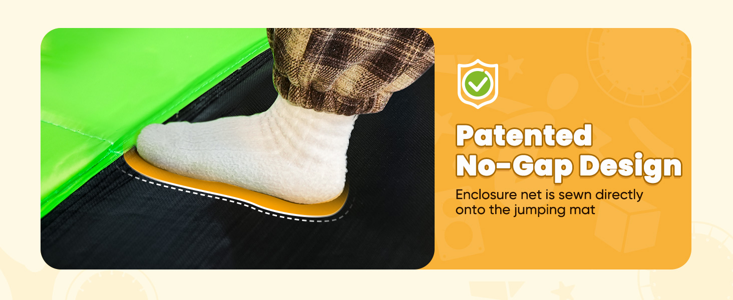 Our patented no-gap design sews the enclosure net directly onto the jumping mat, eliminating gaps and enhancing durability. This innovative feature ensures a safer and longer-lasting trampoline.